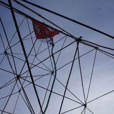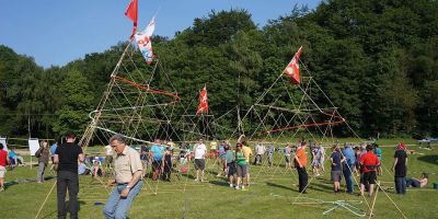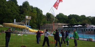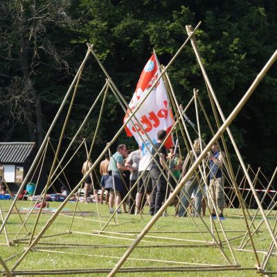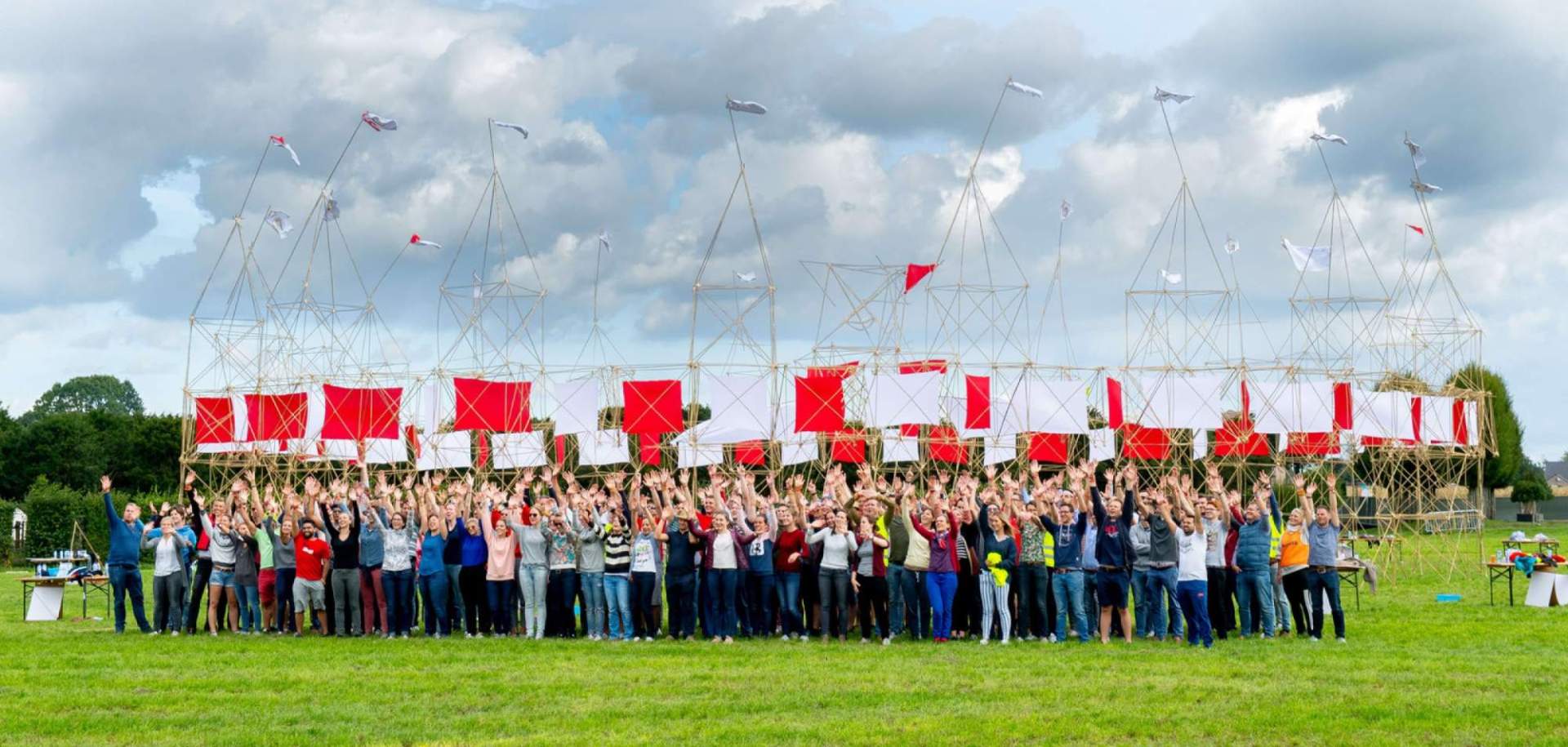 After a short brainstorm about the theme of the building assignment, we set you up in smaller teams. With very simple materials such as bamboo sticks, elastic bands, banners, gutters, cardboard and colored cloths you can build the desired construction. This can range from a giant marble run, triumphal arch, your own castle to a giant beach chair or windmill.